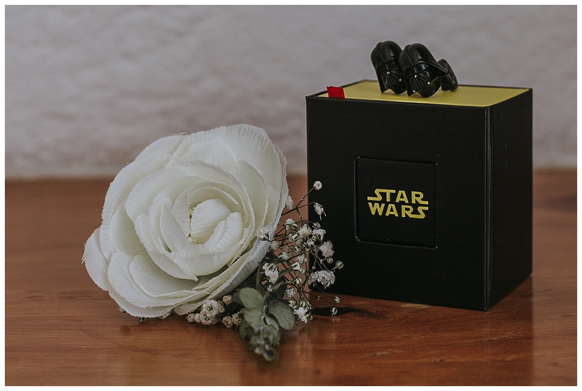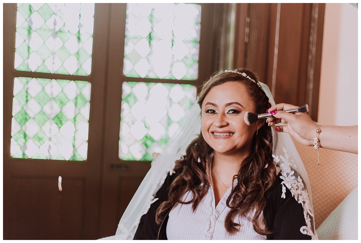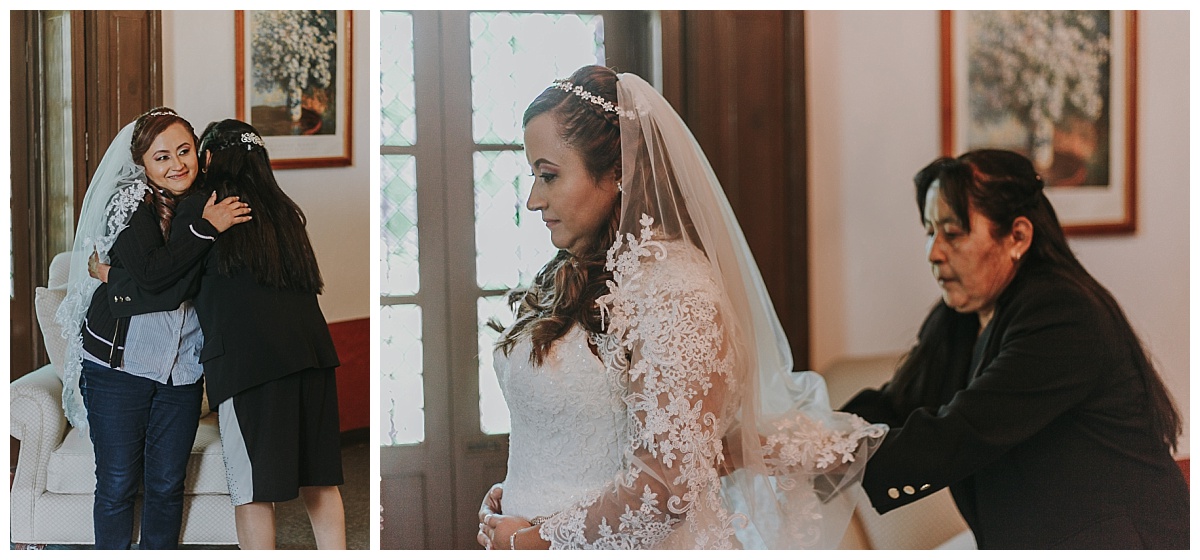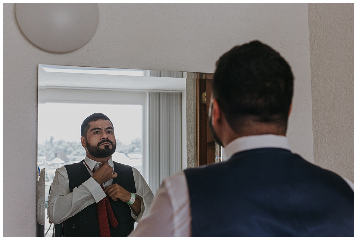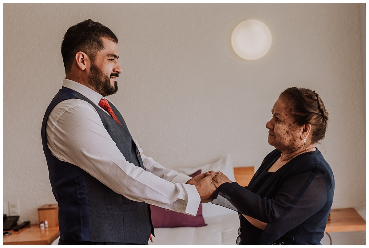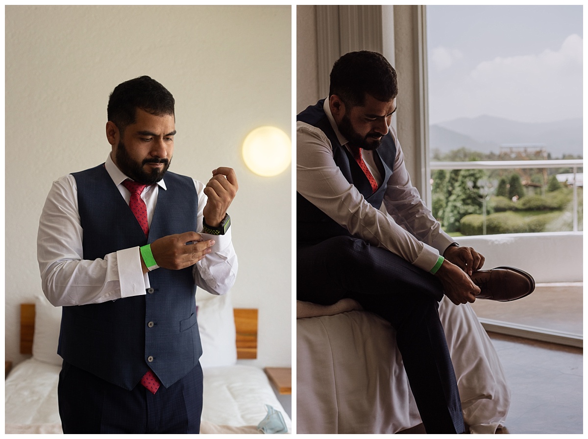 Cubrimos el arreglo de la novia en una habitación de la hacienda y el de Alberto en una habitación del hotel de la hacienda.